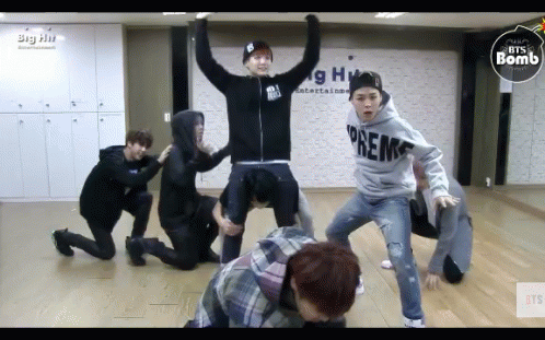 BTS members, including Yoongi (Suga), show off their crazy energetic dance moves in a fun practice session.