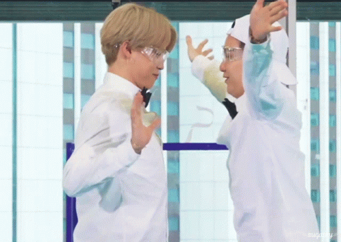 Bts Yoonmin share an adorable hug, laughing and embracing each other in white shirts and safety glasses.