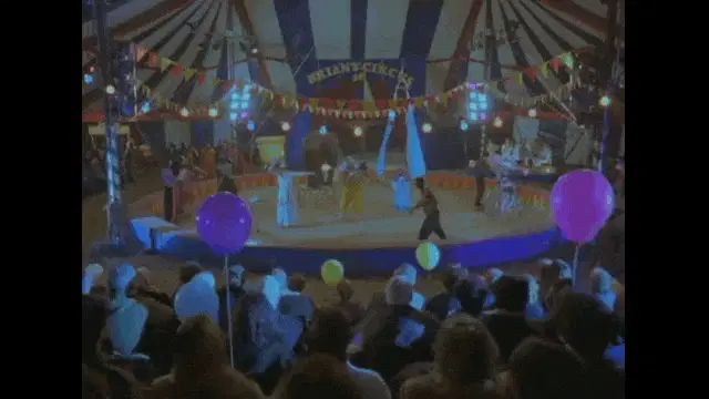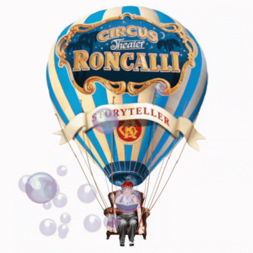 A vibrant blue and white hot air balloon for Circus Theater Roncalli, featuring a storyteller amidst floating bubbles.