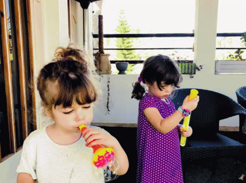 Two young girls happily blowing soap bubbles on a balcony, enjoying their bubbles party.