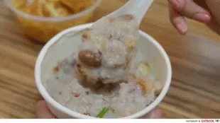 A close-up of a creamy Bubur Empress Porridge, served with a spoon and fried dough sticks.