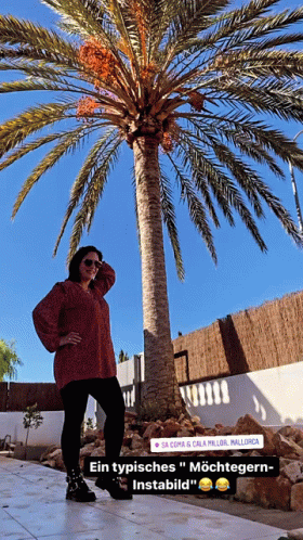 Danni Büchner Karabas poses by a palm tree in Mallorca, a typical "wannabe-Insta-picture" with emojis.