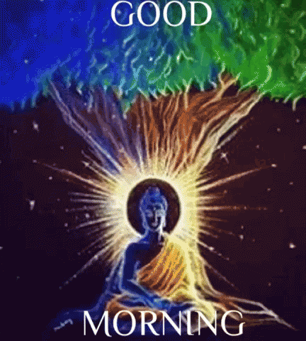 A serene Buddha meditates under a vibrant, glowing tree, radiating light, with a 'Good Morning' message.