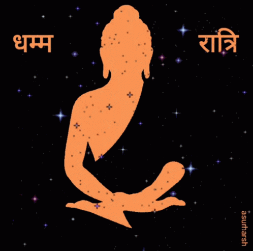 An animated drawing of Buddha's head, surrounded by sparkling stars in a cosmic setting, representing Buddhism.