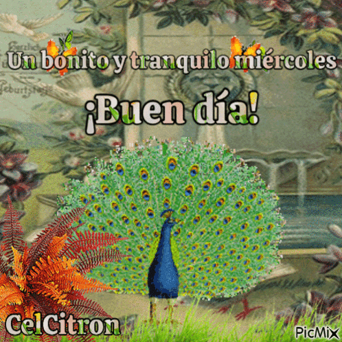 A vibrant peacock with a fanned tail, surrounded by butterflies and foliage, wishing a beautiful and peaceful Wednesday.