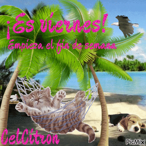 A cute cat relaxes in a hammock on a tropical beach, celebrating the start of the weekend. A dog sleeps nearby.
