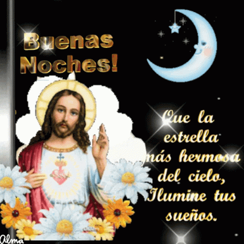 A beautiful 'Good Night' message featuring Jesus, vibrant flowers, a crescent moon, and sparkling stars.