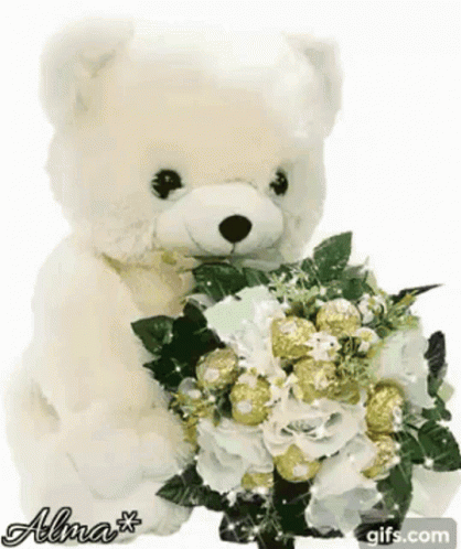 A cute white teddy bear holds a bouquet of white flowers and golden chocolates, wishing 'Buenas Tardes Bendiciones'.