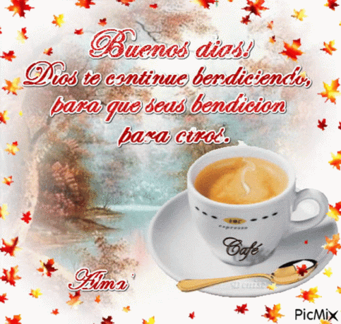 A coffee cup with 'Buenos días' message, surrounded by animated autumn leaves and a scenic background.