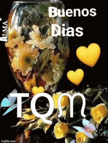 Animated greeting with 'Buenos Dias' and 'TQM' over a vase of yellow flowers and hearts.