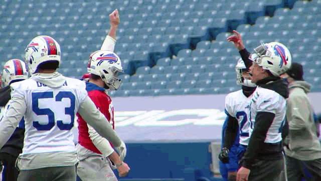 Buffalo Bills players, including Josh Allen, dance and celebrate on the field during practice or warm-ups.