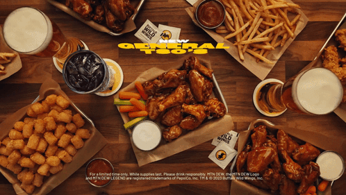 Buffalo Wild Wings advertises its new General Tso's chicken wings, served with fries, tater tots, and MTN DEW LEGEND.