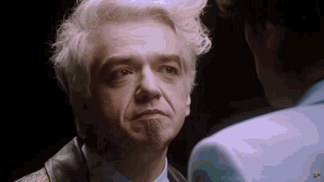 Bugo, from Bugo Morgan, looks at the camera with red lipstick, wearing a light blue blazer.