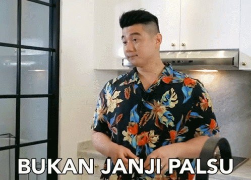 Arnold Poernomo in a floral shirt, standing in a kitchen with the text 'Bukan Janji Palsu' (Not a False Promise).