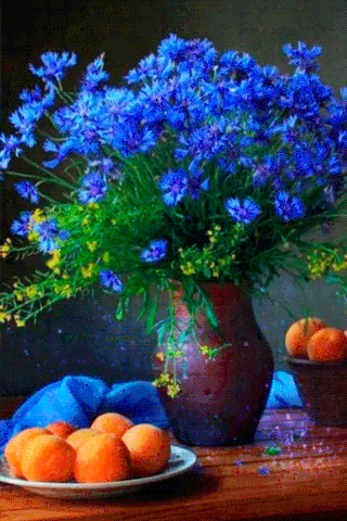Vibrant blue cornflowers in a rustic vase, accompanied by fresh apricots on a plate.
