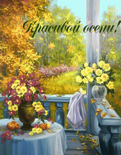 A vibrant painting of autumn flowers on a table with a view of a colorful autumn landscape.