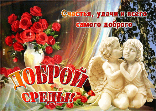 A vibrant greeting card featuring a vase of red roses, two cherubs, and a Russian wish for a good Wednesday, happiness, and good luck.