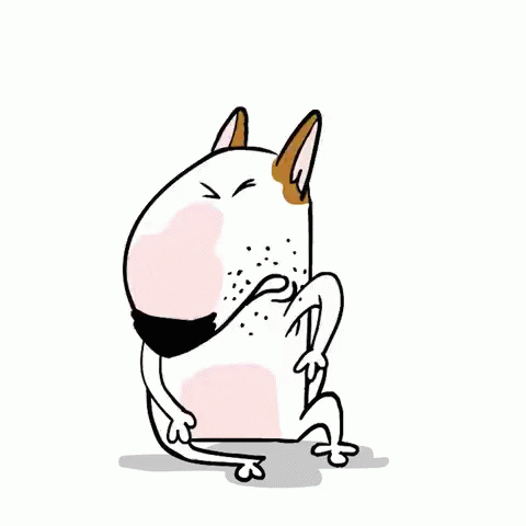 A cartoon Bull Terrier yawns widely, then looks tired and eventually curls up to fall asleep.