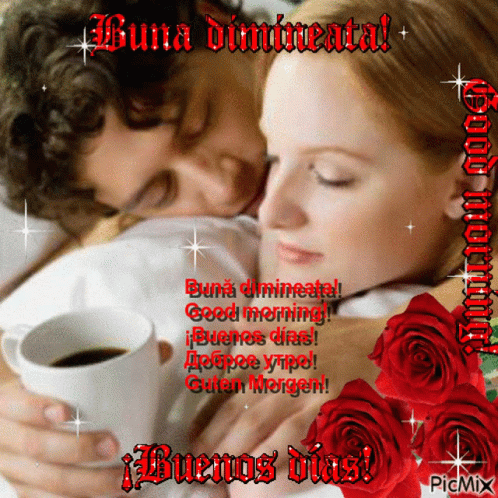 A romantic image of a couple embracing in bed, holding coffee, with 'Good Morning' greetings.