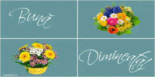 A cheerful 'Bună Dimineață' (Good Morning) message accompanied by beautiful, vibrant flower bouquets.