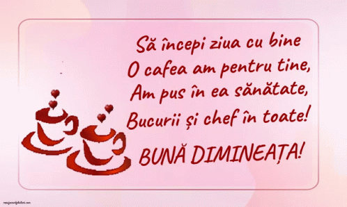 A heartwarming Romanian good morning message with coffee, wishing health, joy, and cheer.