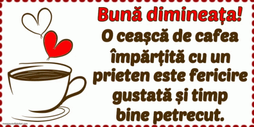 A heartwarming "Good Morning" message in Romanian, featuring a coffee cup and hearts, perfect for friends.