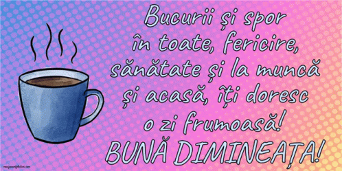 An animated good morning message with a steaming cup of coffee, wishing joys and a beautiful day.