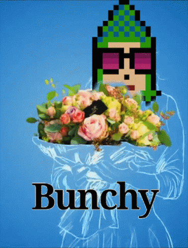 A pixelated Bunchy Cryptopunk character holding a vibrant bouquet of flowers on a green background.