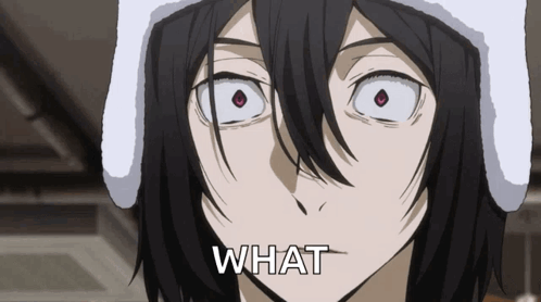Fyodor Dostoevsky from Bungo Stray Dogs with a wide-eyed, creepy smile and the word 'WHAT' superimposed.