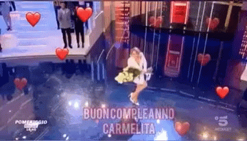 Barbara D'Urso, also known as Carmelita, celebrates her birthday on stage with a bouquet of flowers.