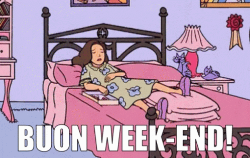 Cartoon girl relaxing on a pink bed with chocolates, wishing 'Buon Week-End!' in an animated scene.