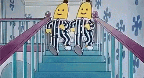 The Bananas in Pyjamas, B1 and B2, celebrate Tuesday by dancing happily down the stairs in their pajamas.