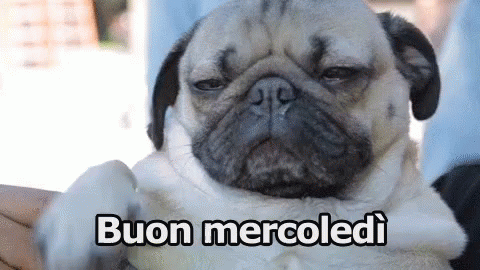 A sleepy pug dog with a grumpy expression, wishing viewers a 'Good Wednesday' in Italian.