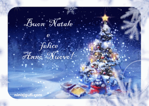 A festive winter scene with a decorated Christmas tree and the Italian greeting 'Merry Christmas and Happy New Year!'