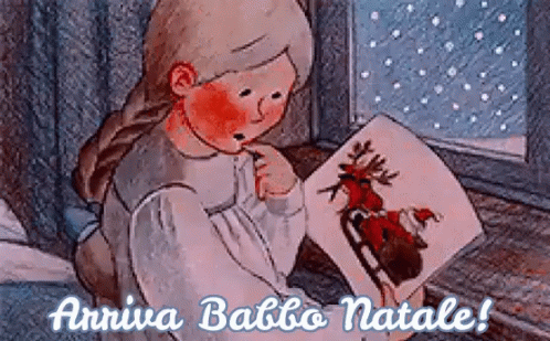 A young girl looks at a drawing of Santa Claus on a sleigh, eagerly awaiting Christmas Eve as snow falls outside.