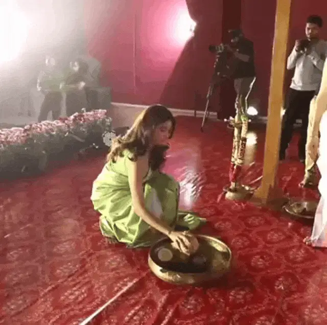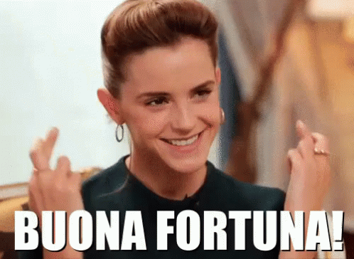 Emma Watson smiles, crossing her fingers and wishing 'Buona Fortuna!' to someone.