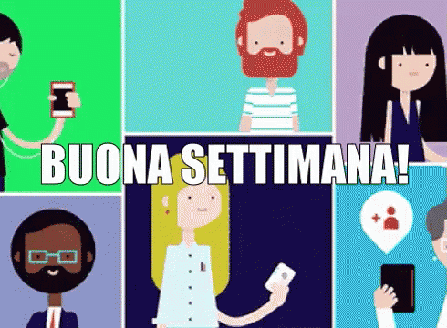 Animated message wishing 'Buona Settimana!' (Good Week!) with diverse characters and mobile devices.