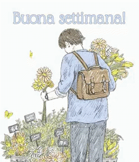 A charming drawing of a man picking flowers from a stall, wishing everyone a good and happy week.