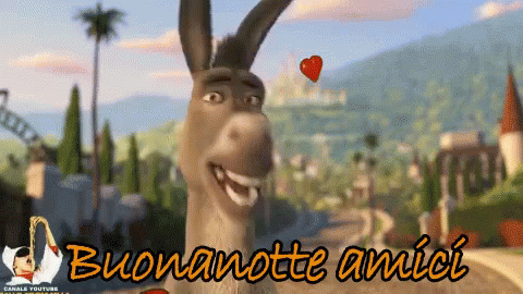 Shrek's Donkey character wishes goodnight with the Italian caption "Buonanotte amici" and floating hearts.