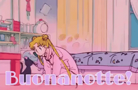 Sailor Moon gets cozy in bed with Luna the cat, wishing everyone 'Buonanotte!' for sweet dreams.