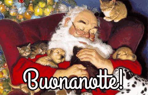 Santa Claus is fast asleep in a red armchair, surrounded by adorable kittens and puppies, wishing everyone a Christmas goodnight.