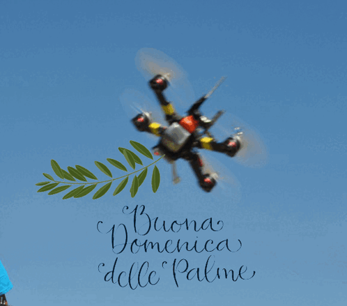 A drone flies through the sky, displaying the Italian greeting 'Buona Domenica Delle Palme' (Happy Palm Sunday).
