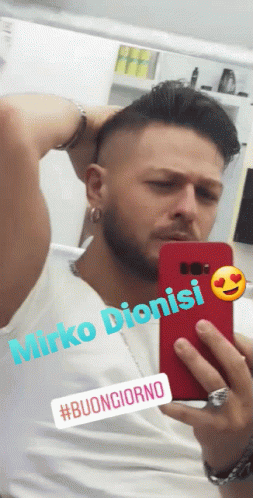 Mirko Dionisi takes a morning selfie, holding a red phone and showing off his fresh haircut and beard.