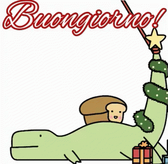 Cute cartoon dinosaur with a Christmas tree on its tail and a 'Buongiorno!' greeting for a festive morning.