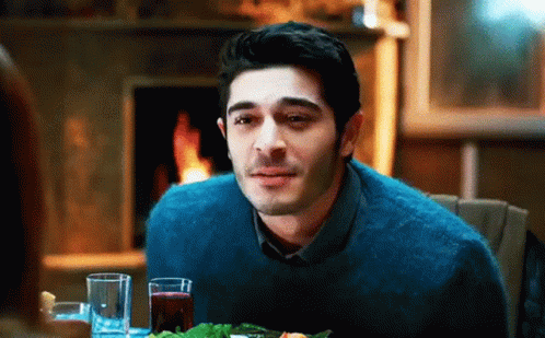 Burak Deniz, wearing a blue sweater, makes a charming flying kiss gesture while sitting at a table.