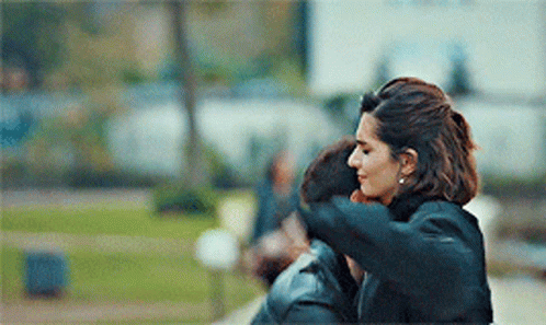 Buraksevinç and Meriçaral share a loving hug by the water, expressing affection and connection.