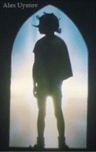 A striking silhouette of Pinocchio, also known as Буратино, standing within an arched window frame, by Alex Uyutov.