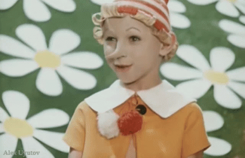 буратино Pinoccio, a cheerful character, smiling and rubbing hands in a daisy field.