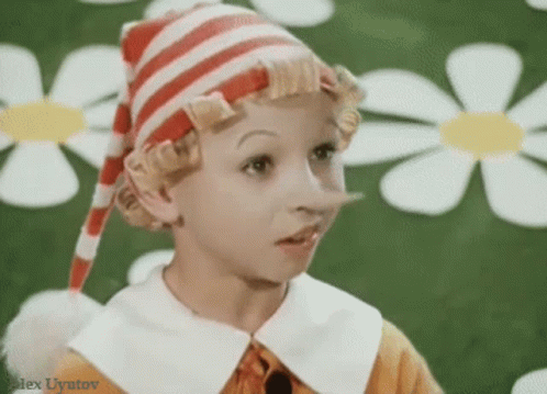 Буратино (Pinocchio) in a striped hat and long nose, touching his head with a silly expression.
