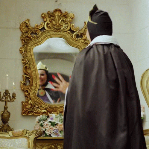 Woman dressed as Snow White's Evil Queen laughing dramatically in front of an ornate mirror.